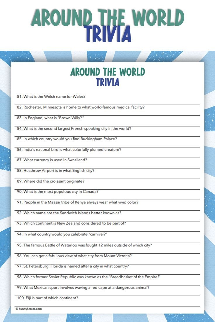 Around The World Trivia For Seniors Elderly Adults Students Family Party Trivia
