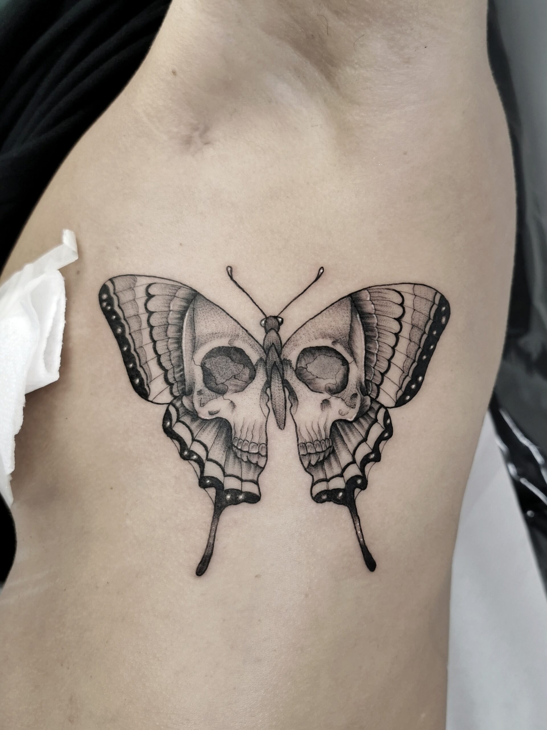 Skull tattoos have long been associated with mortality and rebirth, while butterflies represent growth and change. Combining the two creates a striking image that can hold deep personal meaning for the wearer.
