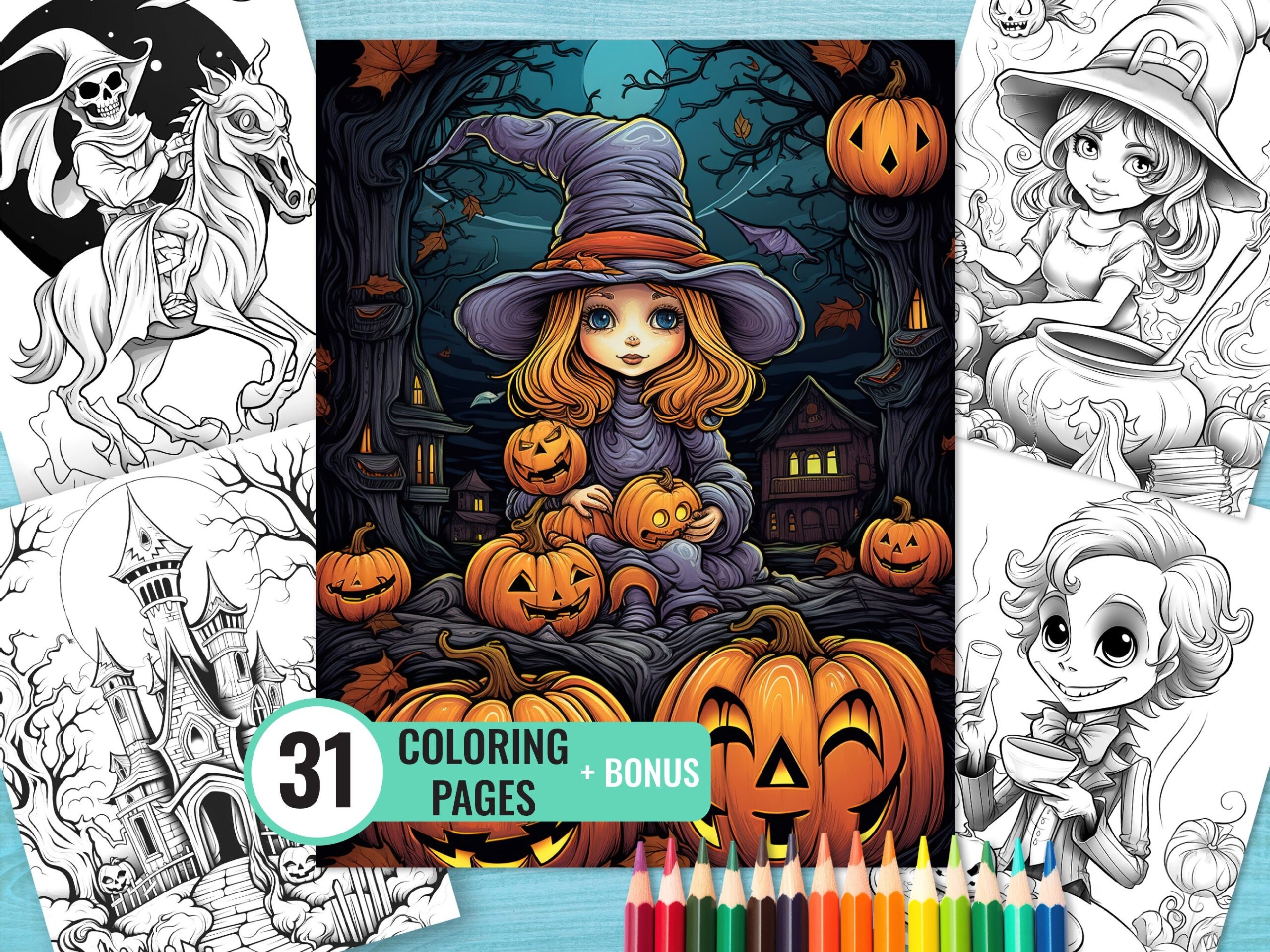 Halloween Coloring Pages 31 Printable Spooky Pages For Kids And Adults Witch Grayscale Coloring Book Instant Download Etsy